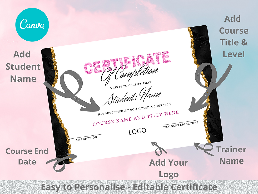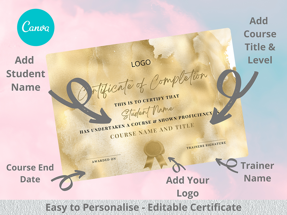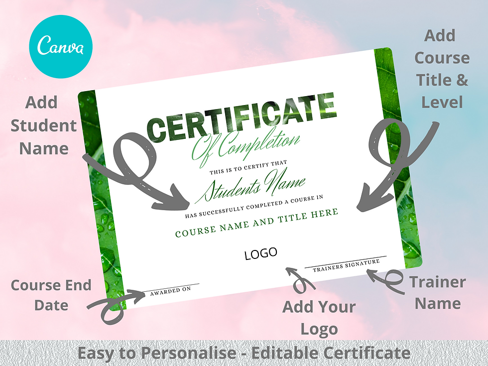 Editing your Certificate is simple. Add your own logo, edit the text and add in the course name and your student name, add in the trainer's details, and even the certificate award date. If you need to add in accreditation details to, this can all be added to your certificate.